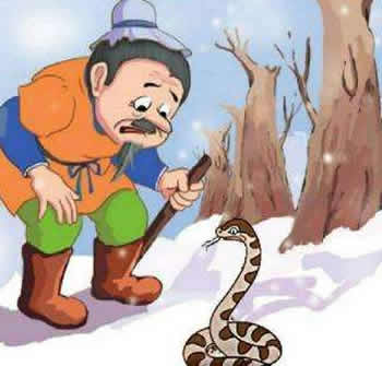 想到这儿,农夫一把将那冻僵的蛇丢在地上,站起身继续赶路。走着走着,农夫的脚步又放慢了下来,他想蛇是会咬人,可是我如果把它救了,我就是他的救命恩人,对待救命恩人他难道会恩将仇报,再咬我一口吗?